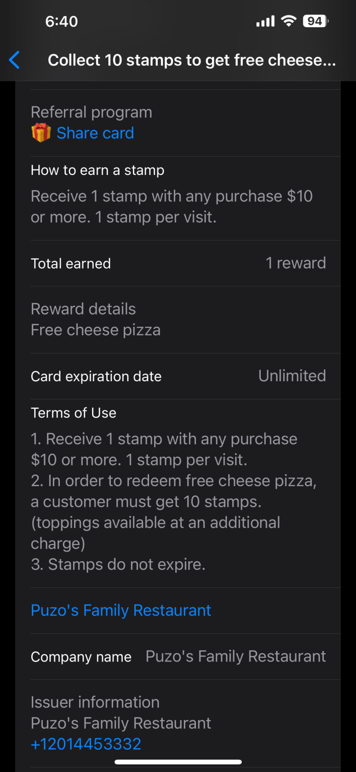Go to pass details to share our loyalty program. You and everyone that joins our loyalty program through your link will get a bonus stamp after their first qualifying purchase and loyalty card scan.