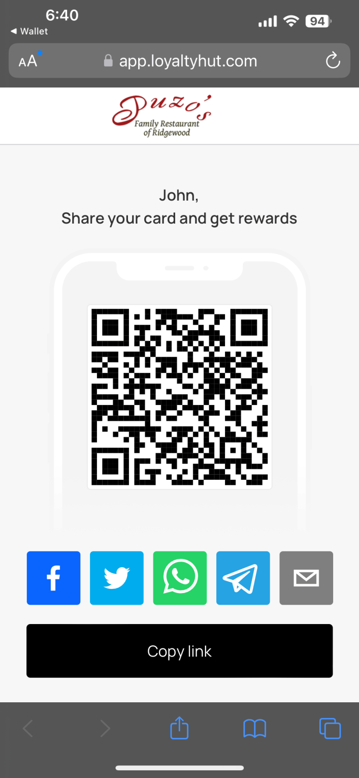 Share our loyalty program any way you like. Sharing options include: Facebook, Twitter, WhatApp, Telegram, Email, and copy link.